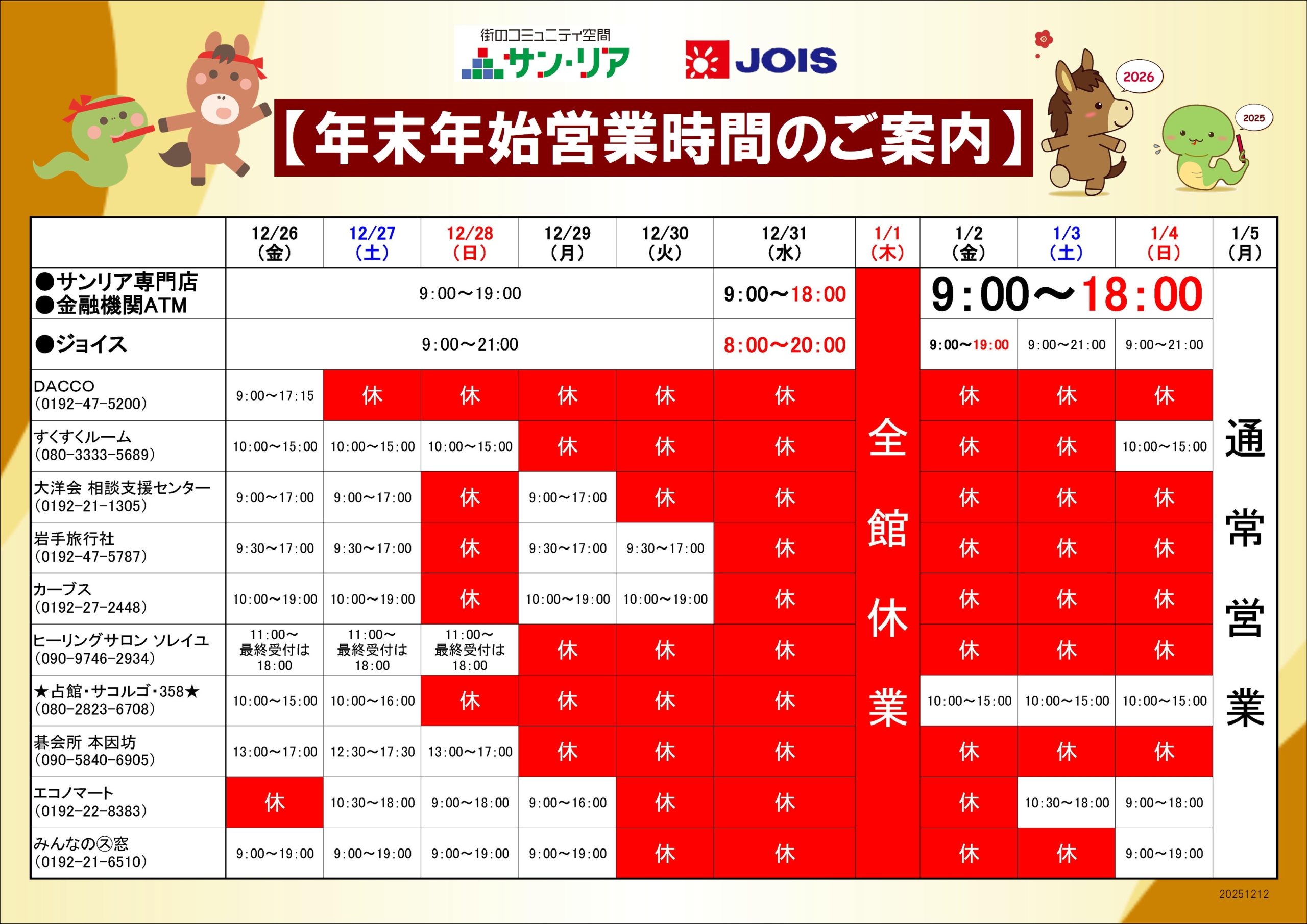 サンリア専門店・事業所及びジョイス大船渡店は、年末年始の営業時間を下記の通り変更させていただきます。 詳しくは下記の画像をご覧ください。
