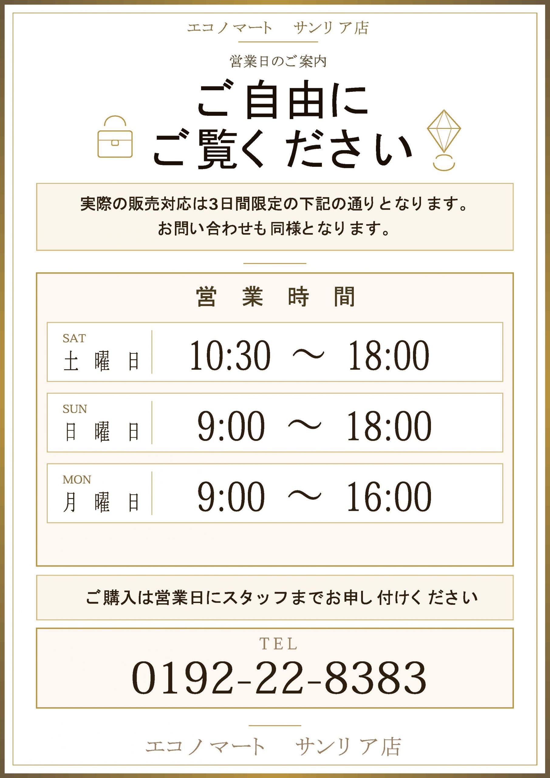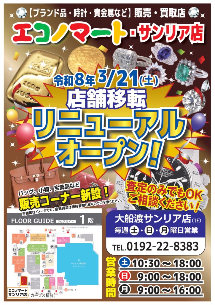 令和8年3月21日(土)、1F エコノマートサンリア店が販売コーナーを新設し、1F カーブス大船渡サンリア店向かいに移転リニューアルオープン!